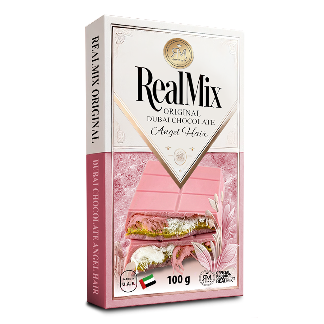 Genieße den luxuriösen Geschmack der REALMIX Dubai Chocolate mit Angel Hair – eine himmlische Fusion aus samtiger weißer Schokolade mit Himbeergeschmack, umhüllt von zartem, zuckersüßem Angel Hair, das an Zuckerwatte erinnert, und gefüllt mit einer reichhaltigen Pistaziencreme. Eine wahrhaft unwiderstehliche Köstlichkeit, die mit jedem Bissen auf der Zunge zergeht!
