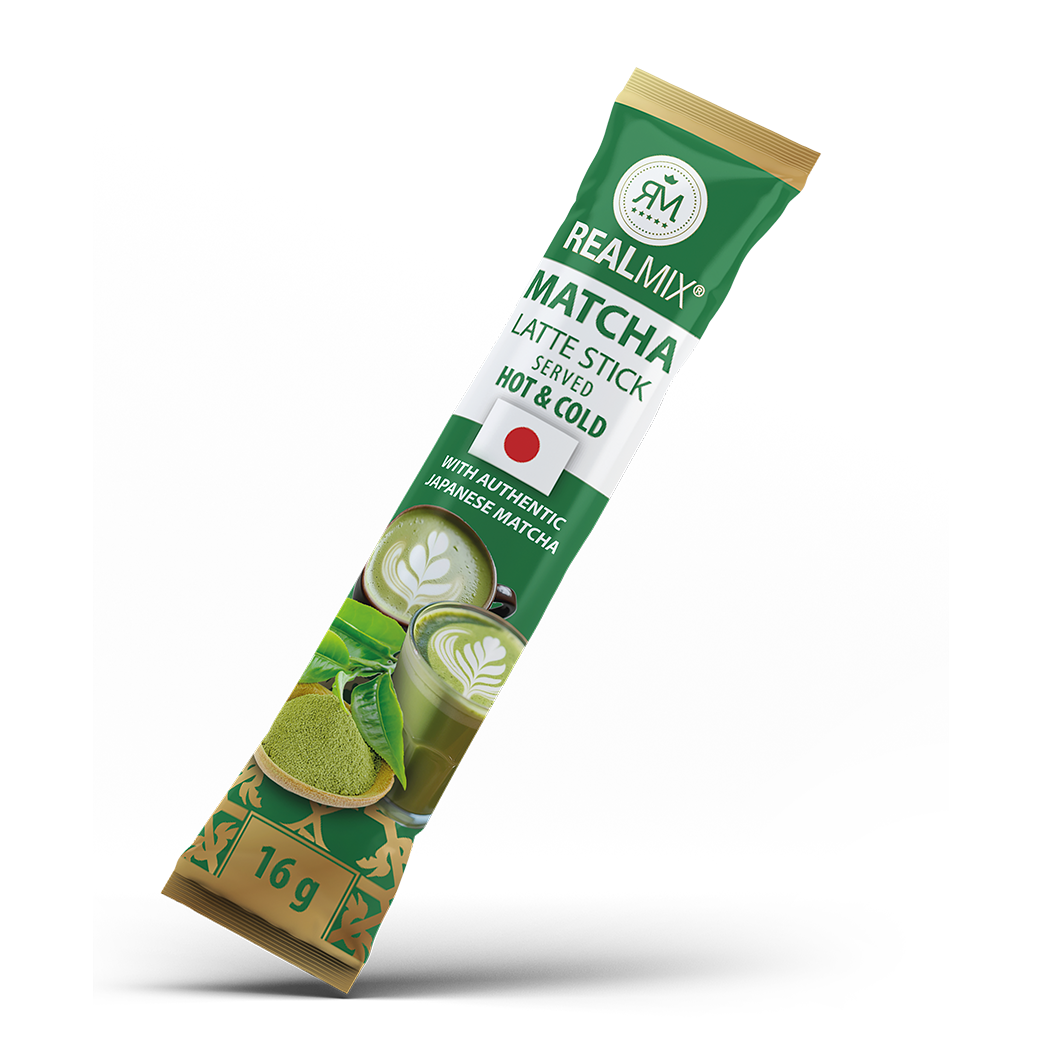 REALMIX MATCHA LATTE STICKS REALMIX INSTANT PULVER MIT MATCHA-GRÜNTEE – Instant-Pulver zur Zubereitung eines Matcha Latte Getränks.Zutaten: Zucker, MagerMILCHpulver, Süßmolkenpulver