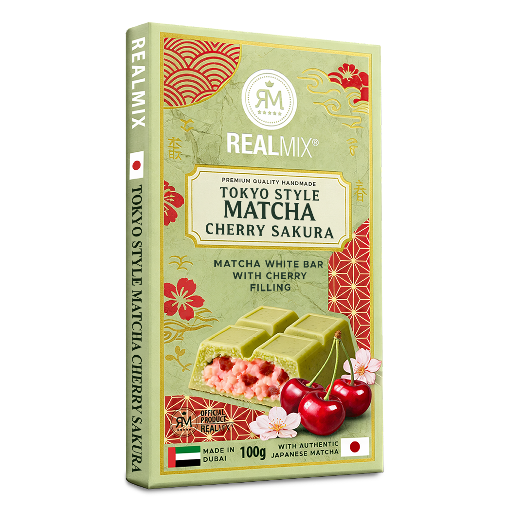 REALMIX TOKYO STYLE TAFEL AUS WEISSER GLASUR MIT MATCHA-GESCHMACK, MIT KIRSCHFÜLLUNG (10 %) Zutaten: Kakaobutter, Zucker, Vollmilchpulver, Palmöl, Kirschstücke, Weizenmehl, gepuffter Reis, Kirschblütenextrakt, Matcha-Grüntee-Pulver (2 %), Emulgator: Lecithin (Soja), Vanillin, Salz, Aromen, Farbstoffe: E102, E129: Kann Aktivität und Aufmerksamkeit bei Kindern beeinträchtigen. Trocken lagern, vor Hitze und Temperaturschwankungen geschützt. Original hergestellt in den Vereinigten Arabischen…