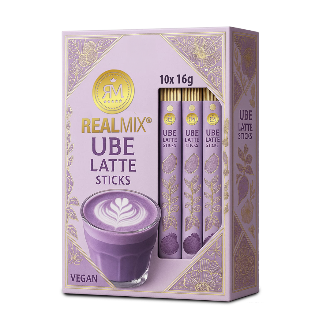 REALMIX UBE LATTE STICKS REALMIX INSTANT-PULVER MIT LILA SÜSSKARTOFFEL-PULVER – Instant-Pulver zur Zubereitung eines UBE Latte Style Getränks.Zutaten: Zucker, Kokosmilchpulver, violettes Süßkartoffelpulver (7 %), Maltodextrin, Trennmittel: E551, modifizierte Stärke: E1450. Kann Spuren von Gluten, Soja und Milch enthalten. Kühl und trocken lagern. Mindestens haltbar bis: siehe Dosenboden. Kühl und lichtgeschützt lagern. Nährwertangaben pro 100 g…